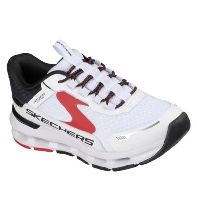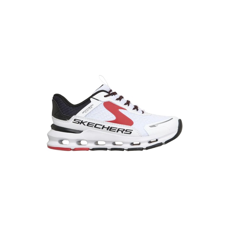 Apresenta cabedal em mesh e material sintético com cordão elástico, entressola geométrica acolchoada Glide-Step® e palmilha Skechers Air-Cooled Memory Foam®.
